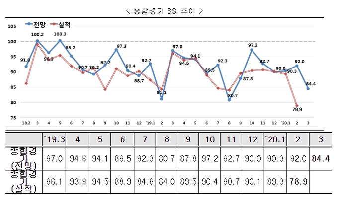 이 조사에 따르면 2월 실적치도 코로나19의 영향으로 78.9를 기록했는데, 이러한 수치는 2009년 2월 글로벌금융위기 때의 62.4 이후 132개월 만의 최저치다.