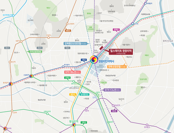 힐스테이트 청량리역은 도시철도 지하철 1호선, 경의중앙선, 분당선, 광역철도 강릉선KTX, 경춘선ITX까지 총 5개의 철도노선이 지나는 청량리역을 도보로 이용할 수 있다.