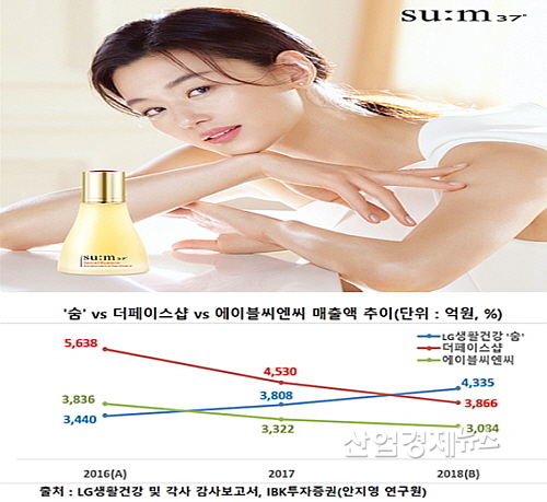 LG생활건강과 더페이스샵, 에이블씨엔씨의 감사보고서(별도기준)및 IBK투자증권 안지영 연구원 보고서에 의거, 숨과 더페이스샵, 미샤의 지난 2016년 이후 2018년까지 3년간 매출 추이를 비교해보면,